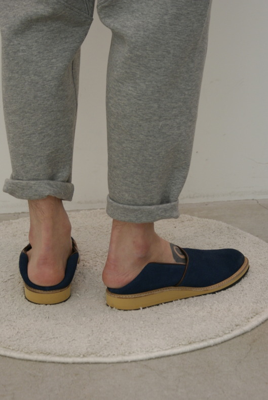 春夏のシーズンの足元を彩る際に絶好のTayler shoes〈テイラーシューズ〉。モロッコの伝統的な履物、バブーシュをソースとしており、手軽に履けるサンダルとしての本来の仕立ては継承しながらモダンにアップデートを計った一足。毛足を刈り上げた裏毛で高級感のあるボディを作り上げながらバフ加工を施す事で趣深い印象に纏めました。若干貼り出したコバも特徴的で、そこに太目のステッチをあしらう事でアダルトなムードに拍車を掛けた仕様に。踵は芯地を抜いており、素足にオープンバックスタイルも叶える作りとしております。フォークロアなスタイリングには勿論、カジュアルに傾倒させたセットアップスタイルにもお使い頂きたい一足が完成しました。