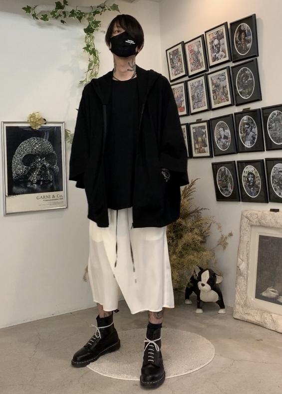 ・ポンチョ風なビッグパーカーとラップショーツの特徴的なシルエットをモノトーンでコーデ。インナーは肌触りの良いタンクトップで今の時期に最適。日頃欠かすことの出来ないマスクをアクセントにモノトーンで統一しています。