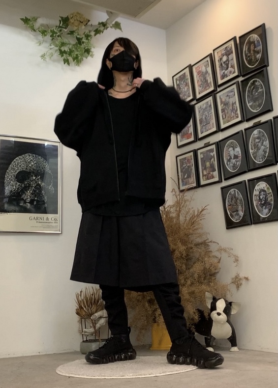 ・ジップパーカーにビッグショーツ、サルエルイージーパンツのレイヤードでストリート感を出したブラックコーデ。インナーはシンプルにロング丈のカットソーをブラックの同色でレイヤード。ビッグショーツは単品ではもちろん、ボトムのレイヤードスタイルにも相性抜群なアイテム。イージーパンツのフロントギャザーのモコモコとボリュームソールのジュエリーのモコモコでさりげない統一感も。