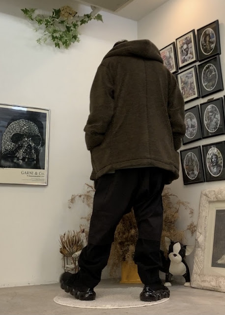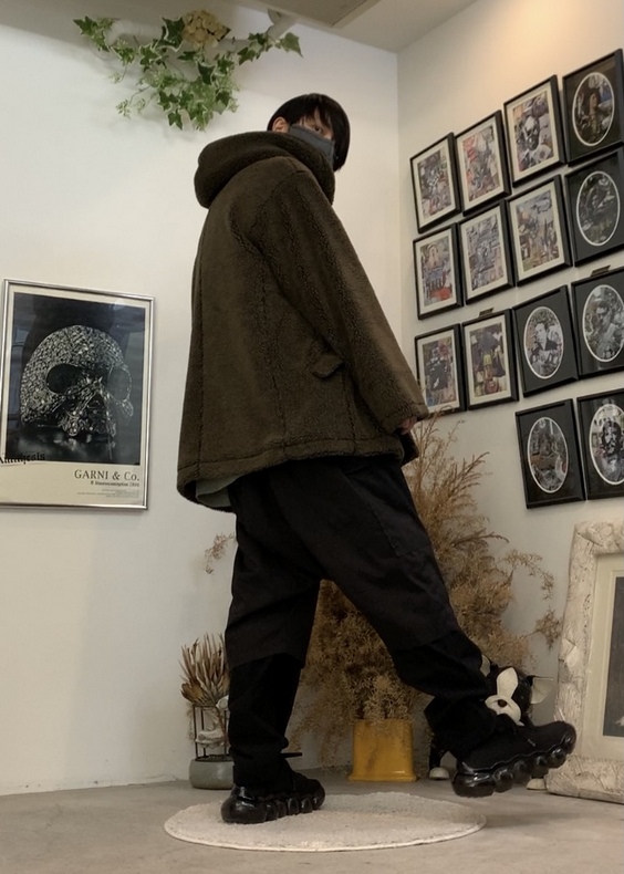 ・昨日に引き続き、寒さが厳しいので今着られるコーデを。ボアコートと圧縮タートルニットで保温性を確保。コートのボタンを締めれば首元を覆えるので更に暖かく。ボトムはナイロンサルエルパンツのクロップド丈にコットン/ナイロンのテーパードパンツをレイヤードで保温性プラス独自なシルエットで。足元はボリュームソールのジュエリーでインパクトも。