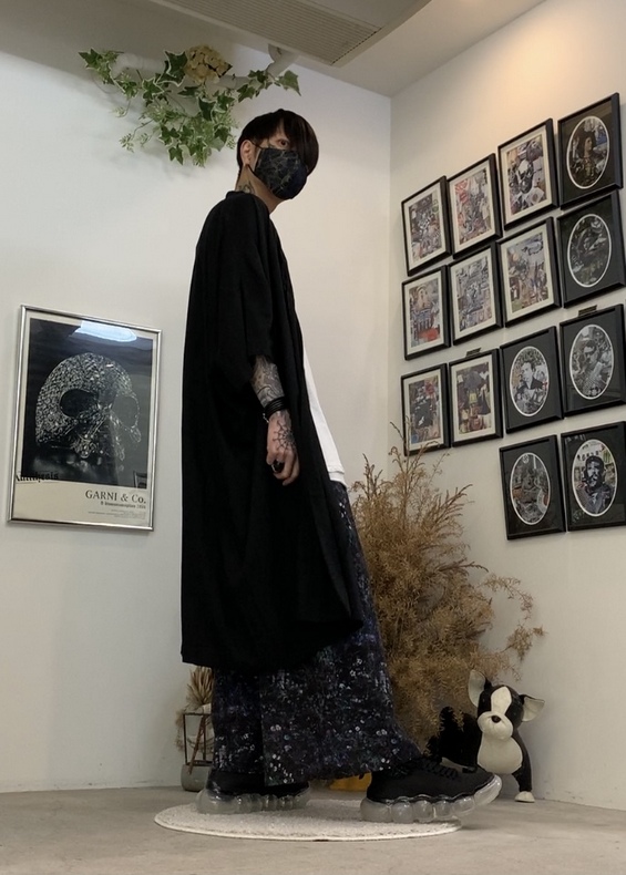 ・ガス焼きのノースリーブとロングタンクをレイヤードで奥行きを出し、ロングガウンでドレープ感を強調。安全ピンネックレスとワイドスラックスの小花柄をアクセントに足元はジュエリーのクリアソールでボリュームプラス。
