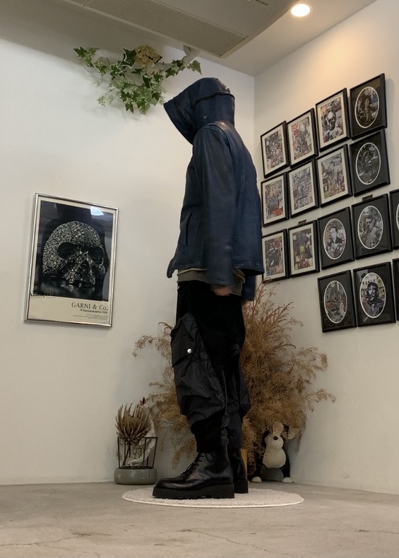 ・首元のギミックが特徴的な経年変化が楽しめるネイビーカラーのライダースにレイヤードスタイルに活躍するガーゼカットソーでタイトめに。ボトムはアンクル丈のサルエルワイドカーゴパンツでシルエットにメリハリを。足元は8ホールレースアップブーツでボリュームプラス。