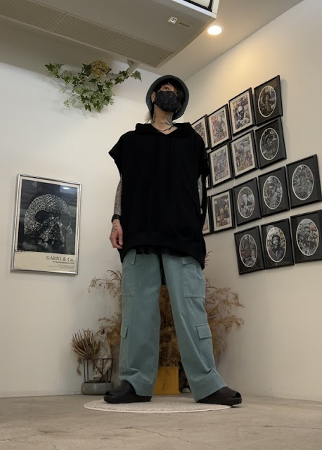 ・ブラックのビッグシルエットノースリーブフーディーに同色のビッグタンクトップをレイヤードで奥行きを。アクアカラーのコーデュロイバケットハットとカーゴパンツで統一感を出し、カラーにメリハリを。軽く開いた首元にブラックスピネルネックレス、足元は幻想的な形状のサンダル、クレイでラフに。