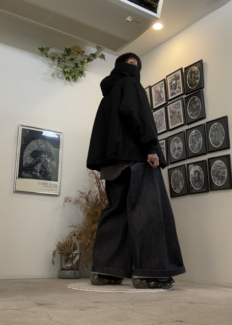 ・ボトムはVOAAOVらしい袴タイプのAラインワイドシルエットデニム。上品なリジッドデニムはムラ糸を使用する事で経年変化も楽しめられます。フロントとバックにそれぞれ1タックずつ入れ、バックのウエスト部分にはボタンを配し3段階でウエストの調整が可能。