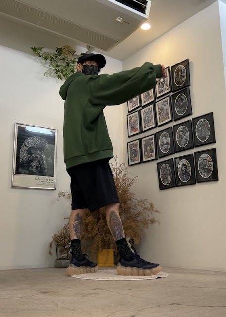 ・足元はgroundsの代表作“JEWELRY”。宝石のような透明な厚底ソールにアッパーはミニマルなポリエステルのニット素材。重量ある見た目とは裏腹に高いグリップ力とフワフワと浮いたような履き心地。歩行の際のプチプチとした感触がどこまでも歩いて行きたくなります。21SSからは足首部分はリブに変更し、よりホールド感がアップしつつも着脱しやすいデザインとなりました。