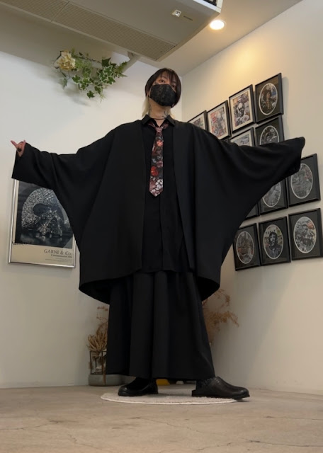 ・ポリエステルトロピカル素材のドルマン着物ジャケットと袴パンツでセットアップ。インナーはデシン素材のドルマンスリーブのビッグシャツをブラックで。首元はブラックスピネルネックレスとフラワータイでアクセントを付け、足元はルームシューズ3のナッパレザーでヌケ感を演出。