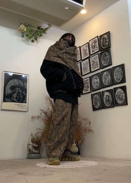 ・ボトムスはmy beautiful landletのリサイクルウールを使用したゴブラン風ペイズリージャガードがインパクトあるワイドイージーパンツ。ブランド定番シルエットのウエストにはタックを入れ、ボリューム・丸みを出したコクーン型のイージーパンツ。