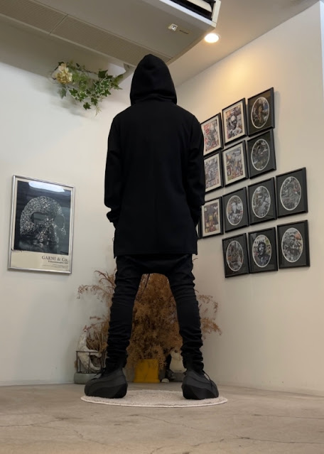 ・フーディーはprasthanaのポリエステルのハイゲージワッフル素材のロングフーディー。着丈は長く、身幅を狭く設定することでメインからレイヤードまで幅広く活躍するアイテム。ドローコードのエンド部分を熱圧着ラバーにて留めています。