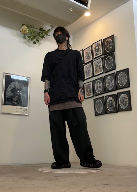 ・シワ加工を施したガーゼウォッシャー素材のレイヤードビッグTシャツにロングタンクトップをレイヤード。ボトムスはコットン/シルク素材でネップ感あるワイドイージーパンツでリラックス。2wey仕様のミニバックパックをアクセントに、足元はジュエリーブラシドフォグでボリュームアップ。