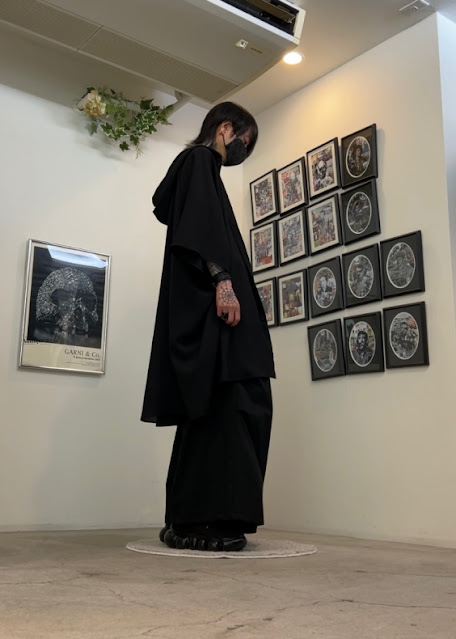 ・シャツはLAD MUSICIANの速乾性に優れ、シワになりにくいポリエステルスパンローン素材は薄手で天然素材の様な表情。フロントは大きめのボタンで身幅を広く取ったフード付きポンチョシルエット。
