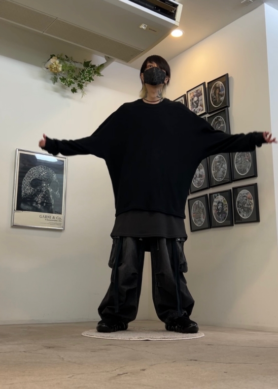 ・トップスはA.F ARTRFACTのオーバーサイズロンクスリーブTシャツ。コットン100%の細かいワッフル素材で編み上げた程く肉厚のある素材でドロップショルダー、ボックスシルエット。裾はラウンドヘム仕様。シンプルですが肩のカッティングはブランドらしさが感じられるアイテム。素材の特徴で経年変化により着込む毎によりルーズに着用出来ます。