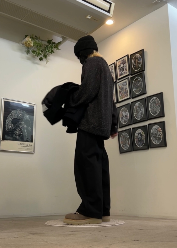 ・メランジVネックニットにキャンバス素材のワンタックバギーパンツでシンプルに。アウターはオーバーサイズシルエットのスーパー100S ウールを使用したウールビーバーブルゾンで上品に。アルパカウールの耳当て付きニットキャップをアクセントに、足元は極太シューレースのレースアップブーツで重量感をプラス。