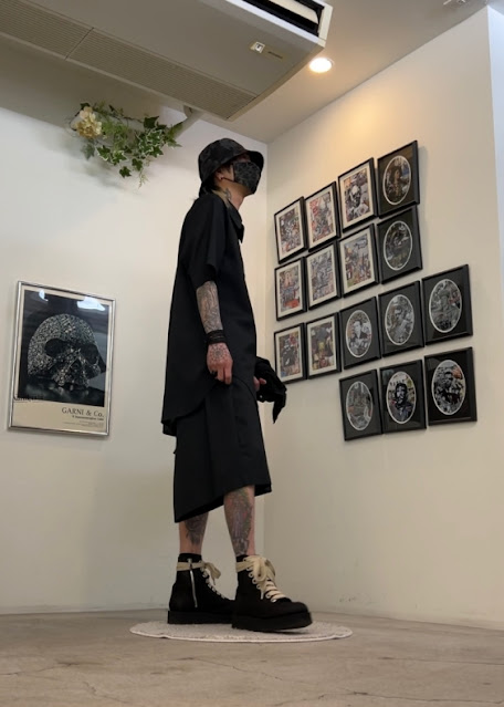 ・ソロテックス×ラミーの機能素材のショートスリーブシャツとワイドショーツのセットアップに10番手のヘビーオックス素材のスタンドカラーブルゾンを羽織で。花と猫をプリントしたバケットハットをアクセントに、足元は極太シューレースのレースアップブーツで重量感をプラス。