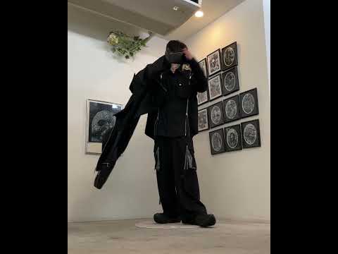 ・4種類のテキスタイルをドッキングしたショート丈ブルゾンのインナーはファスナーの開閉で様々なスタイルに変化するロングスリーブシャツ。ボトムスはストリングデザインがアクセントのカーゴスラックスでスッキリと。足元はオルカでインパクトをプラス。