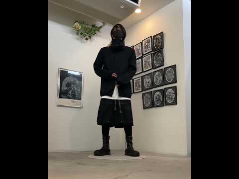 ・キックバックに優れたリブ素材のサイドスリットロングカットソーのアウターは袖が取り外し可能で表面はハイゲージジャージ、裏面が起毛したフリース組織の着心地抜群のハイネックジップアップブルゾン。ボトムスはジャージ素材を使用したサルエルカーゴショーツにレギンスを合わせ秋冬仕様。足元は履き込む毎にドレープが生まれるサイドジップブーツ。