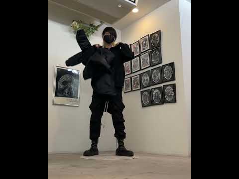 ・デビルフードのジップフーディーにロングリブタンクトップを同色でレイヤード。アウターはリモンタ社製のナイロンシャンブレーを使用したN2-Bをモデルにしたフライトジャケット。ボトムスは保温性の高いボンバーヒートを使用したベルトカーゴサルエルパンツで重心を落とし、足元はアレキサンダーソールを使用したサイドジップブーツ。